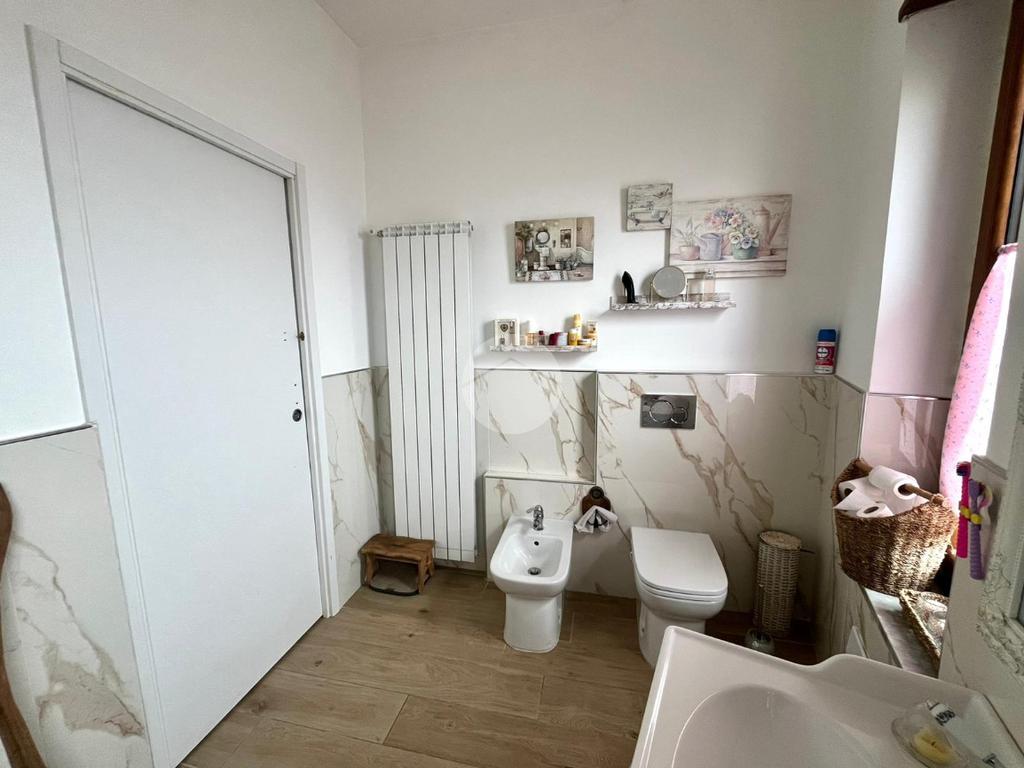 La zona notte è composta da tre camere da letto di generose dimensioni, tutte luminose e con accesso ai balconi. Il bagno, anch’esso ristrutturato, presenta raffinate finiture effetto marmo ed è completo di un ampio box doccia in vetro.